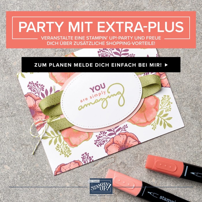 das ist die beste Zeit zum Kreativparty ausrichten 😊! Sie laden ein paar Ihrer Freunde ein und ich kümmere mich um den kreativen Partyspaß. Als Belohnung dürfen Sie sich, ab einem Partyumsatz von mindestens Euro 200,–, Ihre Lieblingsprodukte aus dem kompletten Sortiment aussuchen. Und ab Euro 275,– legt Stampin‘ Up zu dem üblichen Gastgeberbonus noch weitere Euro 27,– drauf!👏👏👏 Ist das nicht klasse?!