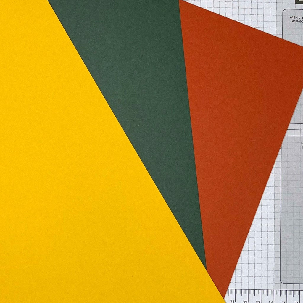 - 6 Blatt Farbkarton A4 (je 2 Curry-Gelb, Lodengrün und Terrakotta)