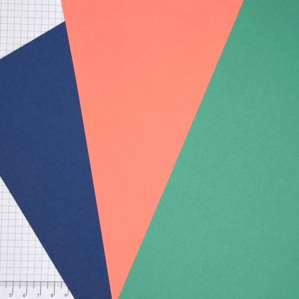 - 18 Blatt Farbkarton A4 (je 6 Blatt in Aventurin, Flamingorot und Marineblau)