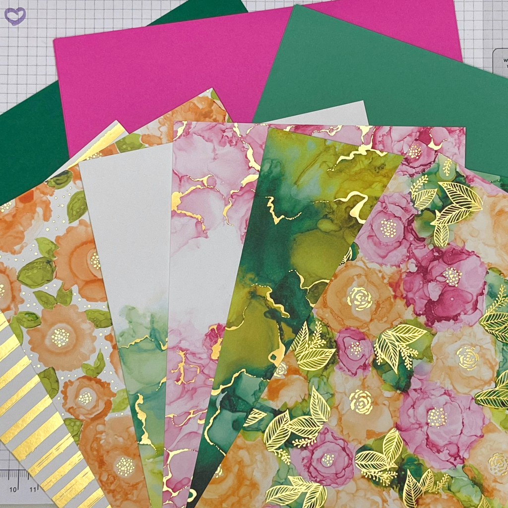- 2 Bögen Roségold und Gold Spezialpapier in 6“ x 6“ (je 1 Blatt pro Farbe)