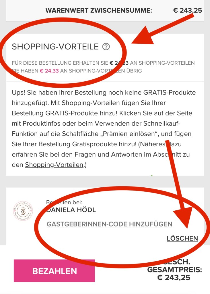 Die Bestellung ist größer Euro 200,— aber noch MIT GASTGEBERCODE im Warenkorb. Damit Sie Ihre Shoppingvorteile nützen können, müssen Sie diesen Code löschen: