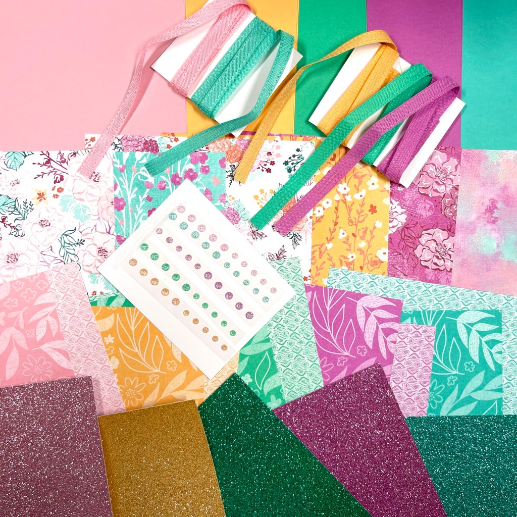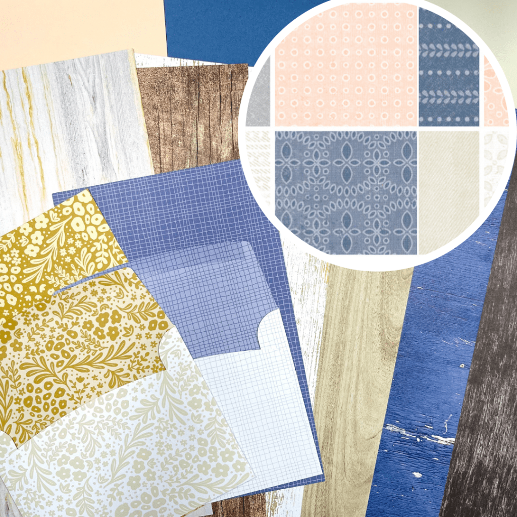 - 10 Blatt DSP in 6″ x 6″ (je 1 Blatt in allen 2 doppelseitigen Designs und 5 Farben)