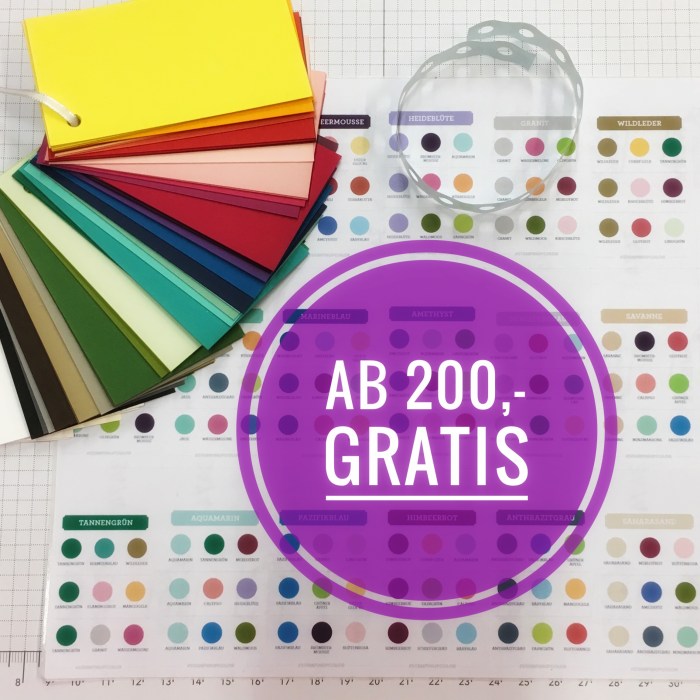 - Ab einer Bestellung von € 200,– bekommen Sie auch heuer ein ganz spezielles Geschenk 😍 und zwar mein Bastelset für den aktuellen Color Coach – sprich Farbfächer 🤩! Sie bekommen alles was Sie dafür brauchen, vom Band zum Zusammenbinden, über alle Farbkartone (inkl. Basispapier wie Flüsterweiß, Seidenglanz, Glanzpapier etc.) bis hin zu den Etiketten und Lochverstärkungen 👍😁. Zusammenbasteln dürfen Sie ihn dann selber, so bleibt auch für Sie etwas zum Spielen 😂… PLUS 1 Pkg. Farbkarton* Ihrer Wahl!